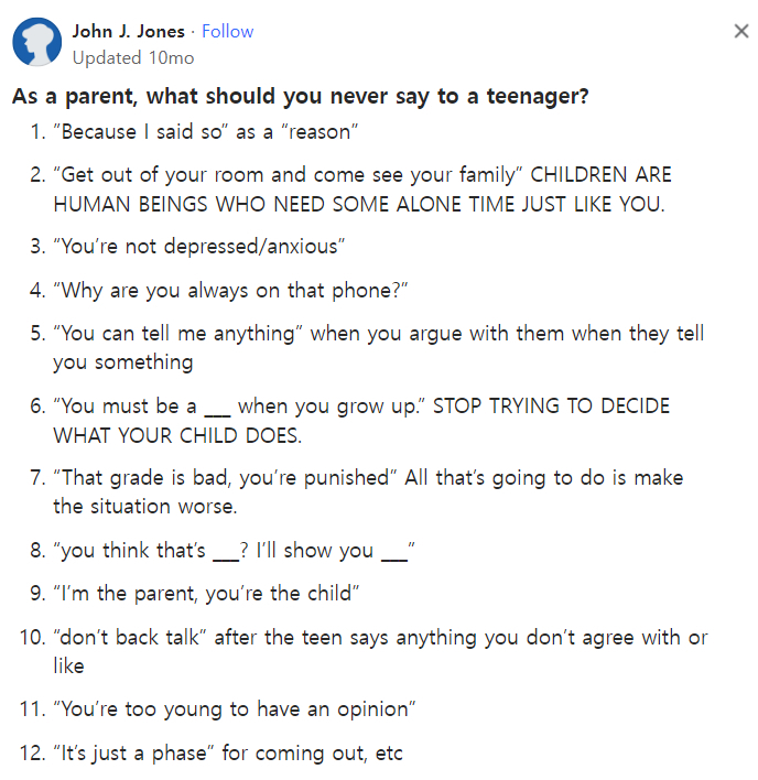 10. 자식이 당신이 싫어하거나 반대하는 말을 하면: "말대꾸 하지마!"