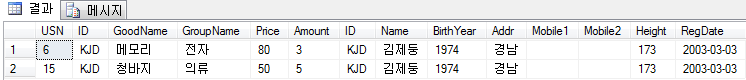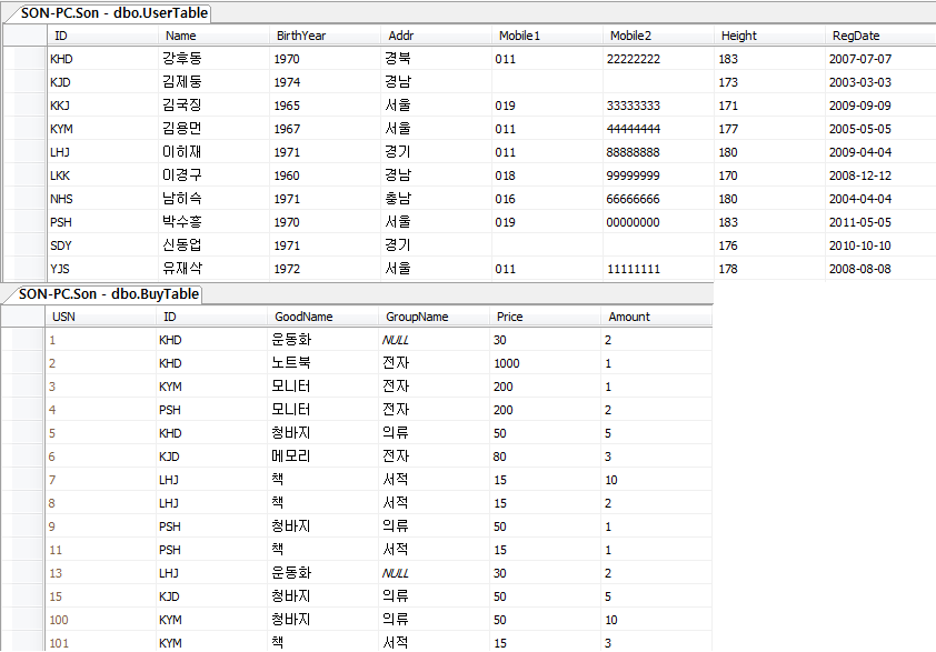 - SELECT BuyTable.ID, Name, GoodName, Addr, Mobile1 + N'-' + Mobile2 AS [연락처]
